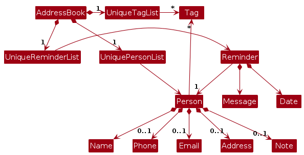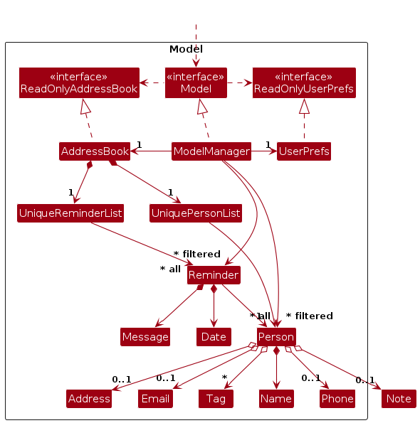 Person objects (which are contained in a UniquePersonList object) and all Reminder objects (which are contained in a UniqueReminderList object).Person objects (e.g., results of a search query) as a separate filtered list which is exposed to outsiders as an unmodifiable ObservableList<Person> that can be 'observed' e.g. the UI can be bound to this list so that the UI automatically updates when the data in the list change.Reminder objects (e.g., upcoming reminders) as a separate filtered list which is exposed to outsiders as an unmodifiable ObservableList<Reminder> that can be 'observed' e.g. the UI can be bound to this list so that the UI automatically updates when the data in the list change.UserPref object that represents the user's preferences. This is exposed to the outside as a ReadOnlyUserPref objects.Model represents data entities of the domain, they should make sense on their own without depending on other components)Note: An alternative (arguably, a more OOP) model is given below. It has a Tag list in the AddressBook, which Person references. This allows AddressBook to only require one Tag object per unique tag, instead of each Person needing their own Tag objects.