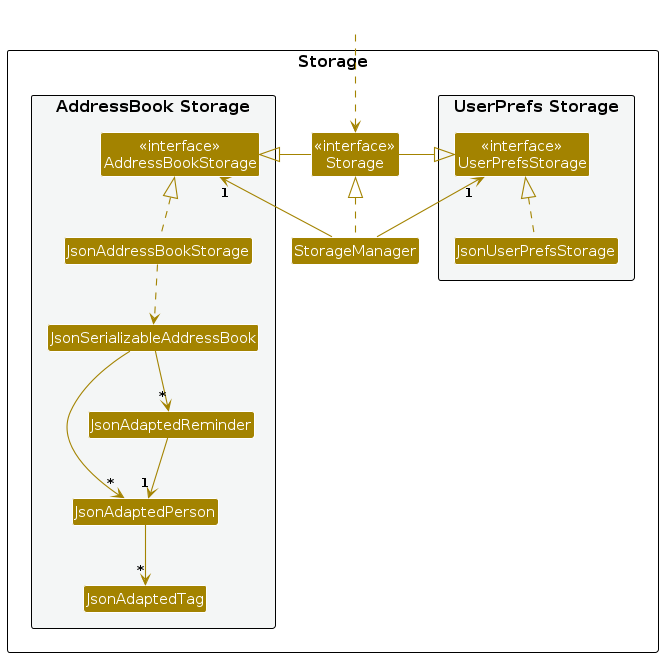 AddressBookStorage, UserPrefStorage and ReminderStorage, which means it can be treated as either one (if only the functionality of only one is needed).Model component (because the Storage component's job is to save/retrieve objects that belong to the Model)Classes used by multiple components are in the seedu.address.commons package.