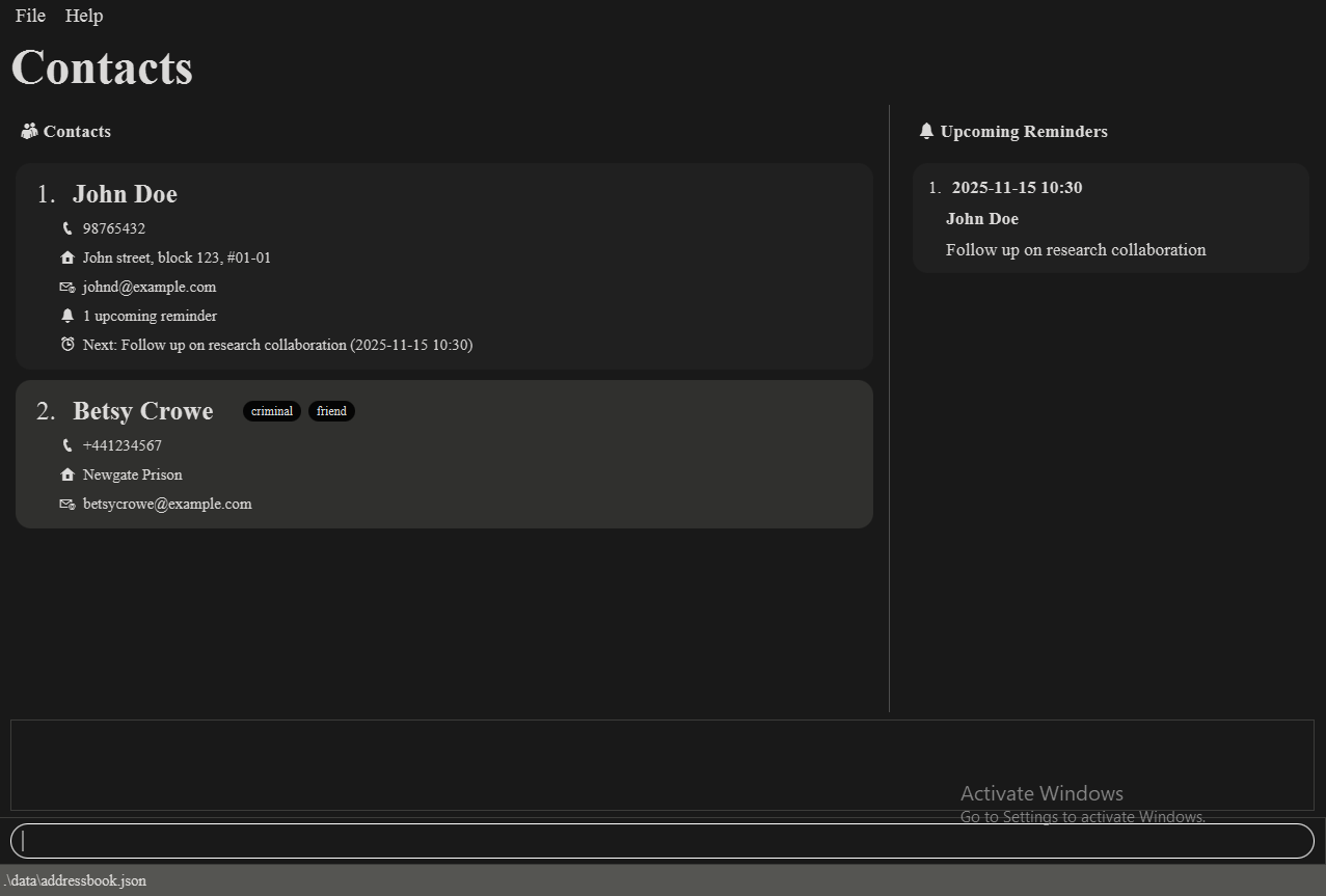 AcademeConnect is a desktop application for managing your contact details, specialised for researchers. While it has a GUI, most of the user interactions happen using a CLI (Command Line Interface).